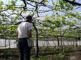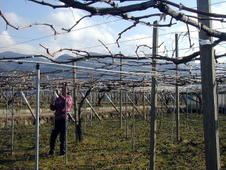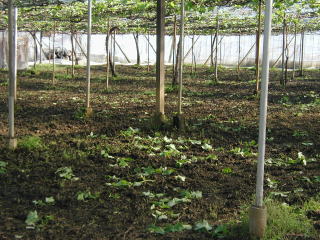 露地の畑では、誘引作業を行っています。 誘引・・葉が、平均に光があたるように、枝を見ながら、振り分け、棚に止めていく作業。 日中は、温室の畑の室温は、30度以上。中に入っての作業は、とても行えません。その間、こちらの作業を行います。今年は、暖冬のため、芽ぶきが早いと考え、慌てないよう、早くから、この作業を行っています。