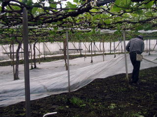 地面にビニールを敷きつめます。湿度のあるハウスの中で、病気を極力減らすためにこの作業は、欠かすことができません (今、敷き詰めているこのビニールは、前年度、天井部分に使っていたものを、再利用し、使用しています。)