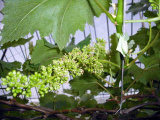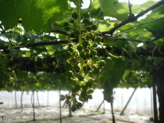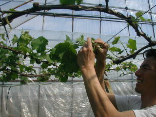 ハウスの中は、春をとおり過ぎ初夏の陽気です。日中、晴天の日は、30度以上の気温。暑いです。今は、つぼみまで成長し、葉が重ならないように、太陽の日が、平均して当たるように、つるを棚に止める作業をしています