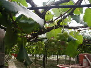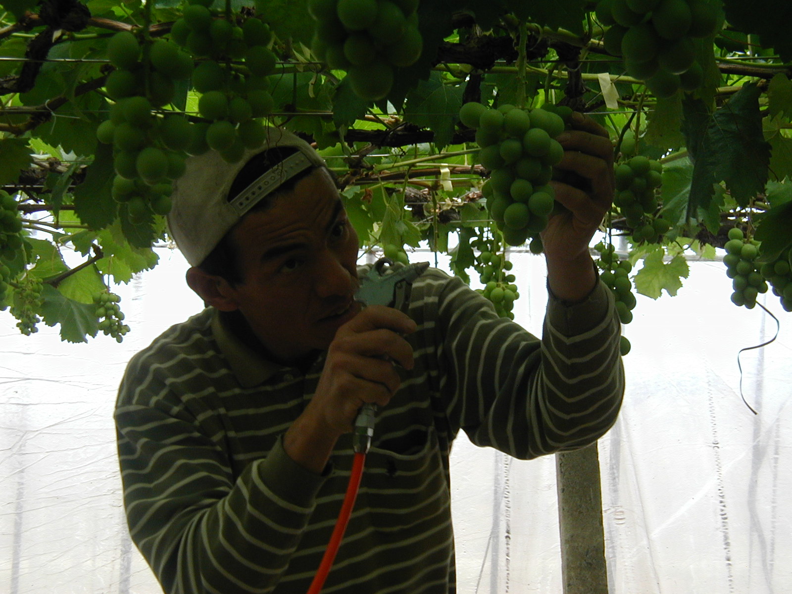 小さな実に成長したものにコンプレッサーという機械で、花かすをとる作業をおこなっています。花かすは、湿度の高いハウスの中では、かび等の病気を発生させるもとになります。必要以上の消毒をさけるためにも、強い空気を一房一房、丁寧にかけながら、花かすを取る作業を行なっていきます。 ![]() |